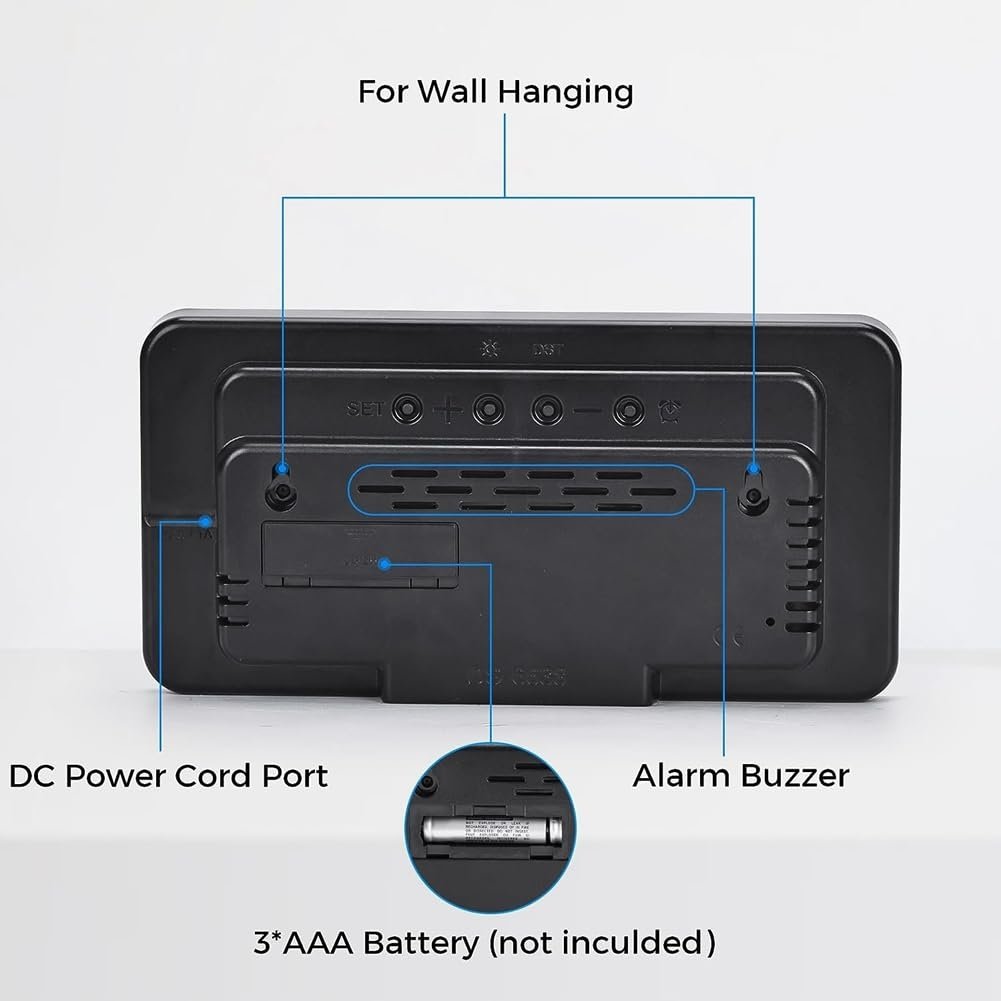 [Dubbel strömförsörjning] – Klockan kan drivas via strömadapter (USB) eller med 3 AAA-batterier (ingår ej). I batteriläge aktiveras en röststyrningsfunktion – displayen tänds i cirka 10 sekunder när den registrerar ljud eller beröring, vilket sparar energi.